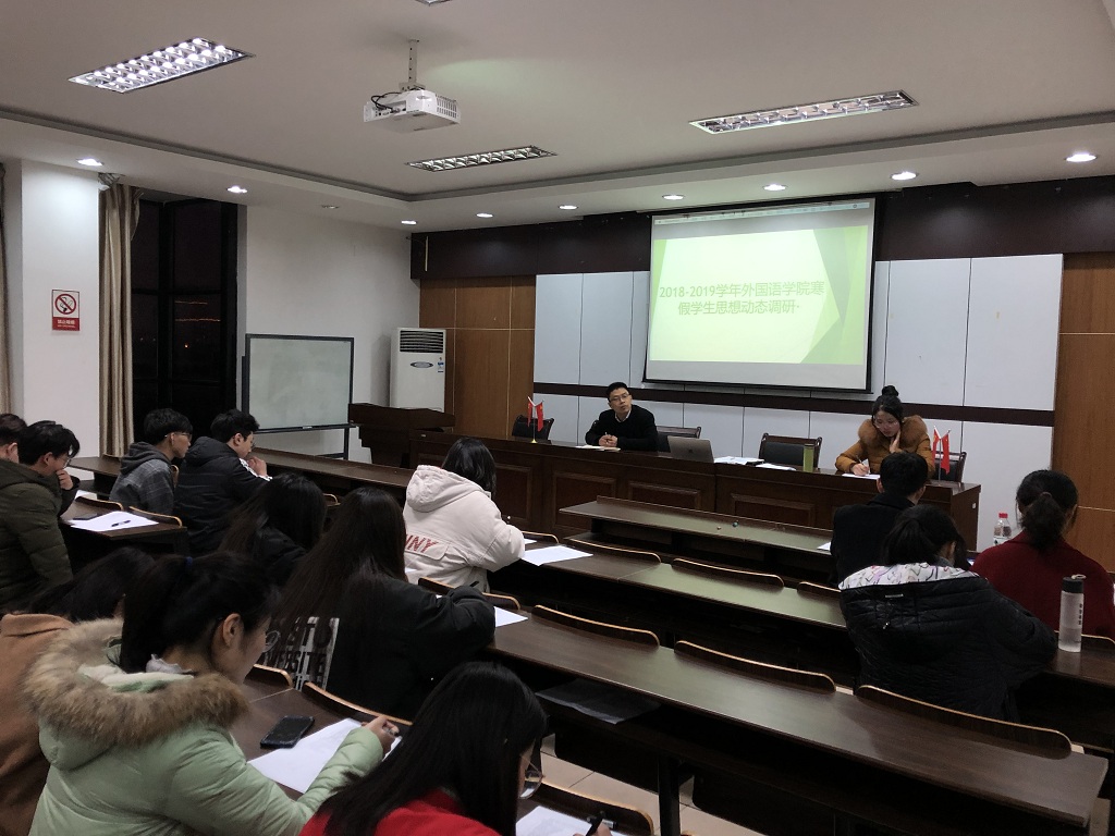2019年2月25日晚,2018-2019学年leyu·乐鱼(中国)体育官方网站寒假学生思想动态调研会在SC405举行。参加此次会议的有:leyu·乐鱼(中国)体育官方网站党总支副书记任凯老师、辅导员刘杜娟老师以及leyu·乐鱼(中国)体育官方网站16级-18级的30余位同学。本次会议以座谈会的方式进行,结合问卷调查、谈心谈话等形式,在轻松愉悦的氛围下拉进学院领导、老师与学生们的距离,了解彼此的寒假生活,并在此基础上对于寒假期间发生的一些社会问题进行探讨,同时征求学生代表们对于学校的意见和建议。