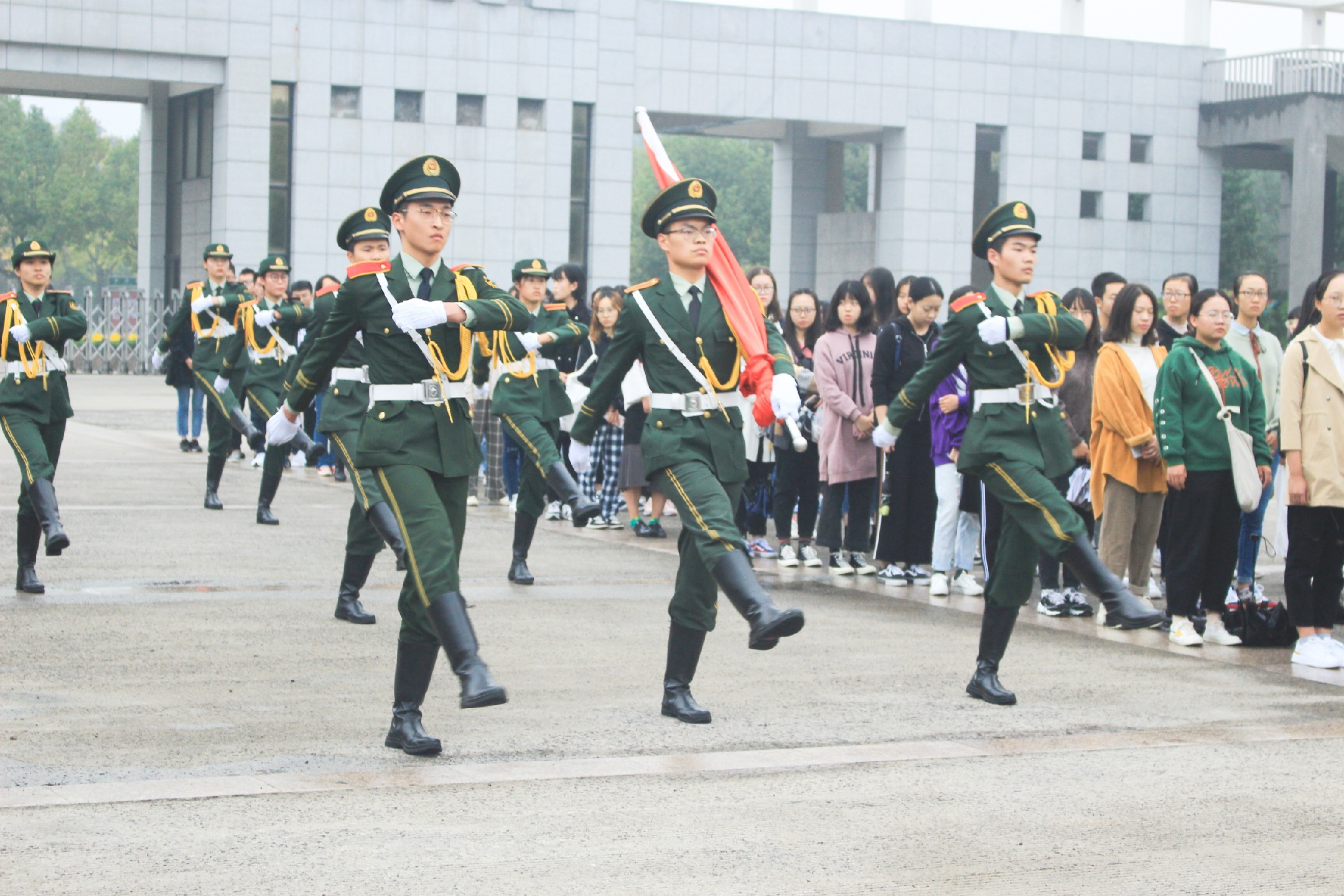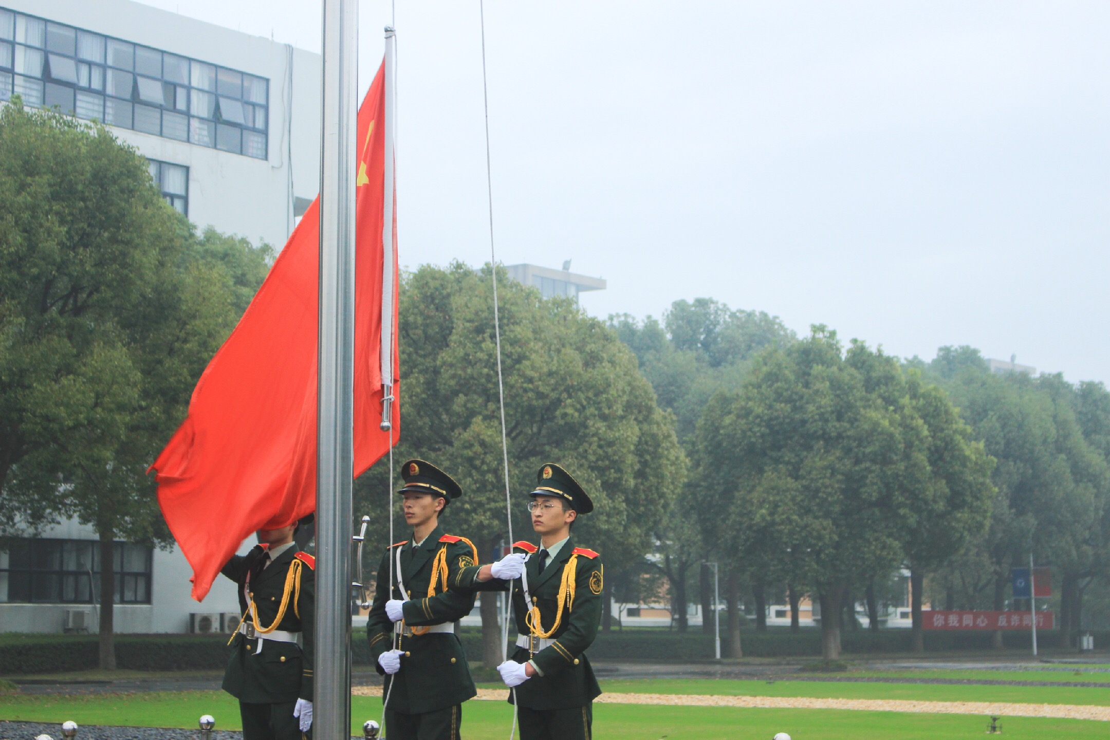 在简短的开场白后,主持人宣布升旗仪式正式开始。仪式第一项,升国旗奏国歌。伴随着响亮的口号声,浙江大学宁波理工学院国旗护卫队踏着整齐的步伐走到国旗台前,步调一致,整齐划一。伴随着国歌奏响,五星红旗在旗杆上冉冉升起,全体师生行注目礼,最终在国歌结束的那一刹那,五星红旗在旗杆的最顶端定格,随风飘扬。整个升旗过程,每位同学都目不转睛地注视着五星红旗,认真对待仪式,彰显了leyu·乐鱼(中国)体育官方网站学子良好的精神风貌。