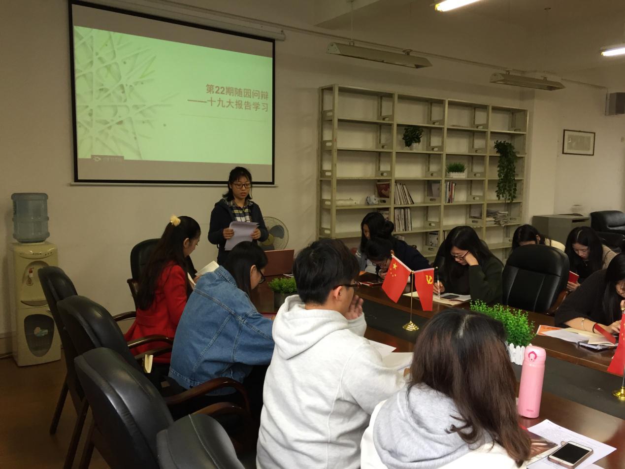 leyu·乐鱼(中国)体育官方网站党总支学生第一支部于2017年11月15日中午在SC408“党员之家”举行了“第22期随园问辨——十九大报告学习会”活动。第一支部书记韩晶晶老师、第二支部书记刘杜娟老师、leyu·乐鱼(中国)体育官方网站团委书记芦美丽老师以及全体学生党员参加了本次活动。 首先,韩晶晶老师为前期举办的学生党员“庆国庆,喜迎十九大”爱国图文征集比赛获奖的党员们颁发奖状与奖品,此项活动开展后得到了全体学生党员的积极响应,大家纷纷用自己的镜头为祖国母亲庆生,为十九大献礼。 随后,韩老师为全体学生党员分发了修改后的新党章,并通过支部书记讲党课的形式为大家提炼和讲解了新党章的主要修改部分,同时要求学生党员在课后结合支部的“阳明静读”活动,认真学习新党章,重温入党动机,不忘初心。 接着,学生第一党支部的党员同学们以“习近平总书记所作的十九大报告”为主题,结合支部正在创建的品牌支部“知行合一党旗红”活动,每位同学都以三分钟小型演讲的形式,声情并茂地讲述了自己眼中的十九大与“知行合一”中相通的理念。黄颖同学在演讲中讲到:“知是行之始,行是知之成。作为一名党员要时刻铭记党章党规、深入学习习近平总书记系列重要讲话,坚持学用结合、以知促行,真正做到把合格的标尺立起来,把做人做事的底线划出来,把党员的先锋形象树起来,用行动体现信仰信念的力量。”王薇同学则对主席十九大报告中的“青年兴则国家兴,青年强则国家强。青年一代有理想,有本领,有担当,国家就有前途,民族就有希望。”我对这句话感触很深,希望自己将来能够借着读书、工作的机会,开拓视野,形成兼容并包的思维方式与心态,更加坚定地顺从内心,为实现人生理想而奋斗,为实现中国梦助力,有意愿、有能力、有信心与国家发展同行。 本次学习活动旨在要求学生党员将十九大报告和自己的品牌支部特色、学生党员身份相结合,融入自身的理解,谈谈自身的感受,规划自身的行动,能够促使学生党员更加深入地学习和理解十九大精神。 |