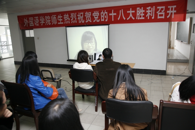 大会开始前,外语学院的师生早早的来到转播点收看新闻,等待开幕那一特殊时刻的到来。第三支部的支部书记李炜和学生党员张珊珊代表支部党员与远在美国印第安纳波利斯大学学习的党员陈婷、叶百卉进行了视频联线交流,陈婷、叶百卉看到久违的同学和老师非常激动,她们表示:尽管远离祖国,但是作为一名党员,心里期盼着十八大的召开,也看到美国媒体的一些报道,在美国的一年多时间里,她和他的同学们充分感受到了当地师生对中国迅速发展的钦佩,她祝福国家在党的十八大后继续发展繁荣。