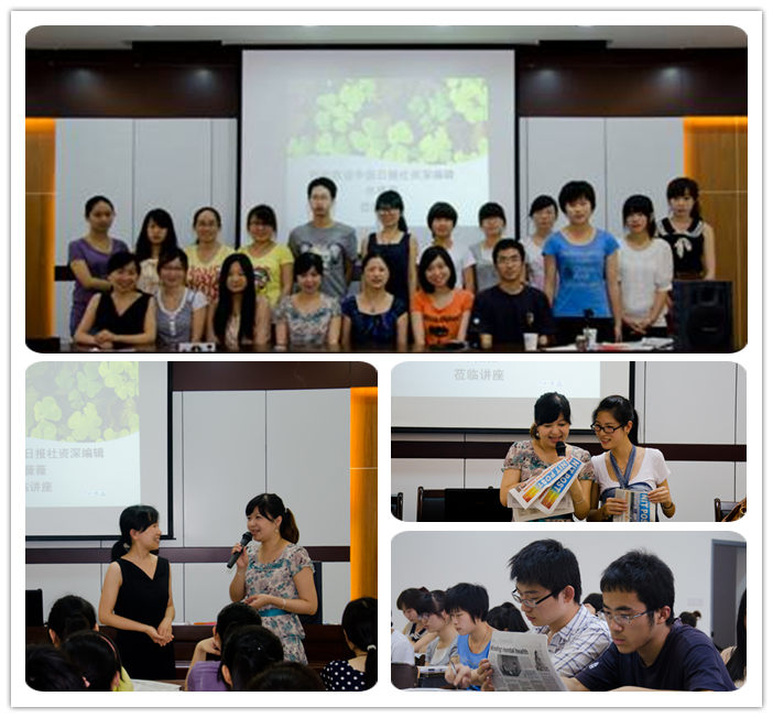 接着,她解释了新闻的特点,并着重讲解了如何写好校园新闻报道。她指出,要写一篇好的报道,要经过选主题、找资源、做研究、采访、总结等步骤。期间,许老师和英文报记者们积极互动,就美剧、微博等当今热点话题进行了交流讨论。最后,许老师就如何提高英文写作水平,给同学们推荐了New York Times、Guardian等英文杂志周刊及Flipboard、Zacker、Ted等网站。讲座现场气氛热烈,同学们积极参与,受益匪浅。