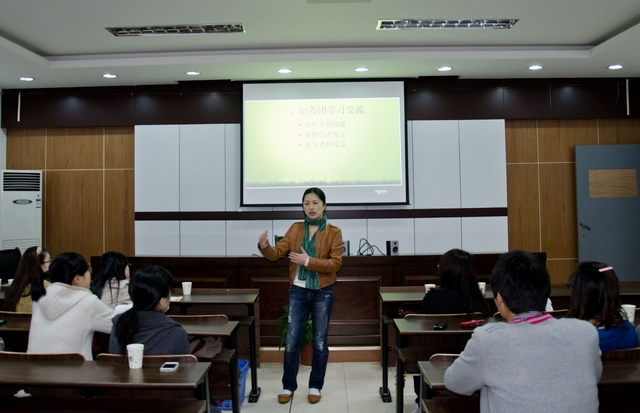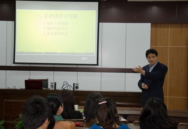院长助理兼记者团指导老师王国凤、记者团指导老师丁旭分别作了发言,她们从把握新闻素材的时效性、突出新闻报道的价值性、加强版面稿件的协调性等方面着手为学生记者们提了不少好的建议。随后,英文报的四位版面编辑及记者团团长针对各自版面所存在的问题进行了汇总交流讨论。