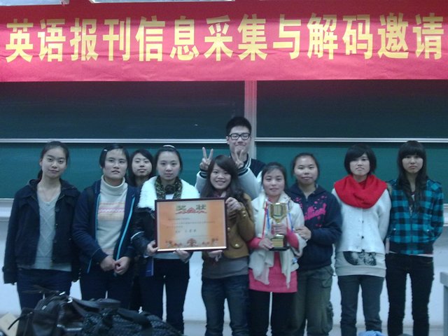 近日,从第五届英语报刊信息采集与解码能力邀请赛传来喜讯,竞赛决赛于2010年11月28日在浙江大学紫金港校区举行,本届大赛共有13支参赛代表队,其中包括浙江大学、浙江师范大学、浙江财经大学、杭州师范大学、浙江工商大学、浙江农林大学、浙江理工大学等强队。经过激烈的竞争,我校选手获得团体三等奖,叶蒙双、夏晓丽、闻人姚安、于佳秋4位同学获得个人三等奖,潘越等6位同学获得入围奖。外语分院孙娟和宋岩两位老师获得竞赛最佳组织奖。