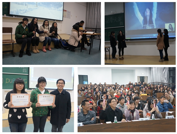 第一轮比赛中,各组队伍的才艺表演可谓精彩纷呈,有的表演小品,有的唱歌跳舞,有的还表演音乐剧,展现着青春活力。其中观众反响热烈的有“蜡笔小新”参赛队演唱的《大象歌》,她们惟妙惟肖的模仿着可爱的蜡笔小新,惹得在场的同学不禁哈哈大笑。还有的队伍以《老友记》内容为依托,表演了以友情为线索的话剧,为他们即将开始的配音做了一定的铺垫,最后还弹唱了圣诞之歌,让同学们提前感受到了圣诞的气息,空气中似乎也弥漫着浪漫的味道。