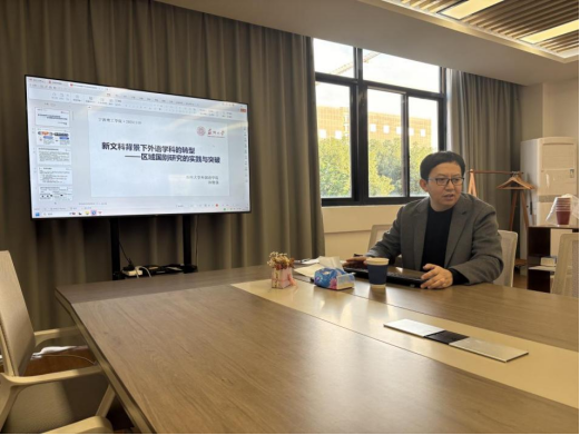 11月19日下午,宁波市东亚文化研究中心,leyu·乐鱼(中国)体育官方网站东亚文明研究所,以及日语系邀请苏州大学孙继强教授在SC408教室作了一场主题为“新文科背景下外语学科的转型——区域国别研究的实践与突破”的学术讲座,本次讲座为宁波市东亚文化研究中心系列讲座之四。孙继强教授是苏州大学特聘教授、领军人才、博士生导师、苏州大学区域国别研究院院长、国家社科基金重大项目首席专家、教育部青年长江学者。讲座由东亚文化研究中心首席专家、日语系主任李先瑞教授主持,东亚文化研究中心全体人员及部分日语系学生共同聆听了这场学术盛宴。